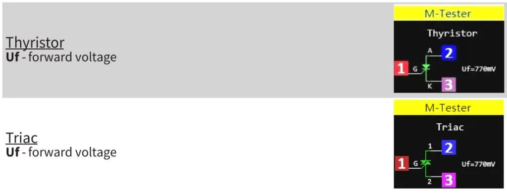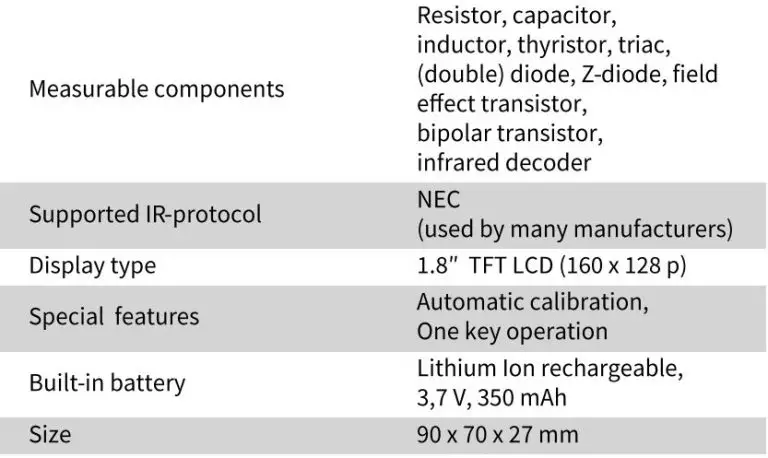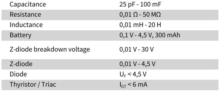 Этот измерительный прибор может обнаруживать и измерять диоды, Z-диоды, двойные диоды, резисторы, конденсаторы, катушки индуктивности, тиристоры, симисторы, полевые транзисторы, биполярные транзисторы и батареи. Далее вы найдете информацию о том, как измерить компонент и какие значения можно измерить для конкретных компонентов.