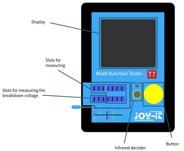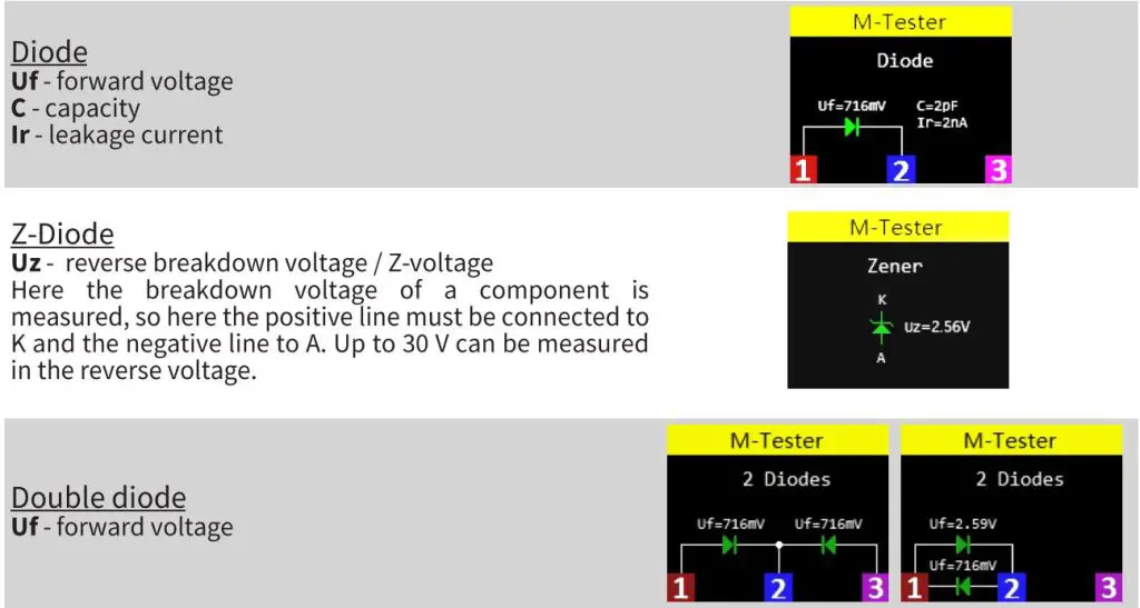 Для измерения компонента вы можете использовать слоты 1-3. Только убедитесь, что вы не подключаете два кабеля к одному каналу, то есть к одной и той же цифре. Таким образом, вы должны выбрать любой слот на 1, 2 и 3 для трех подключений. Для измерения объема пробояtage, используйте каналы K и A. Подключите положительный вывод к K, а отрицательный к A. Вы найдете дополнительную информацию в разделе Z-Diode.