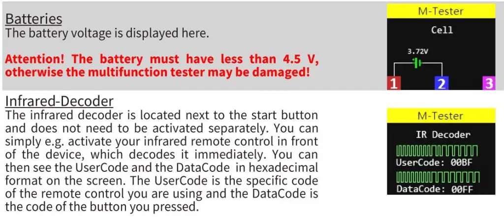 С устройством особенно легко работать, так как все измерения запускаются нажатием одной кнопки. Благодаря встроенной батарее емкостью 300 мАч измерения можно проводить и в дороге. Аккумулятор заряжается с помощью блока питания на 5 В (приобретается отдельно) и прилагаемого кабеля micro-USB. Кроме того, это измерительное устройство может декодировать инфракрасные сигналы и отображать их в виде формы волны на дисплее.